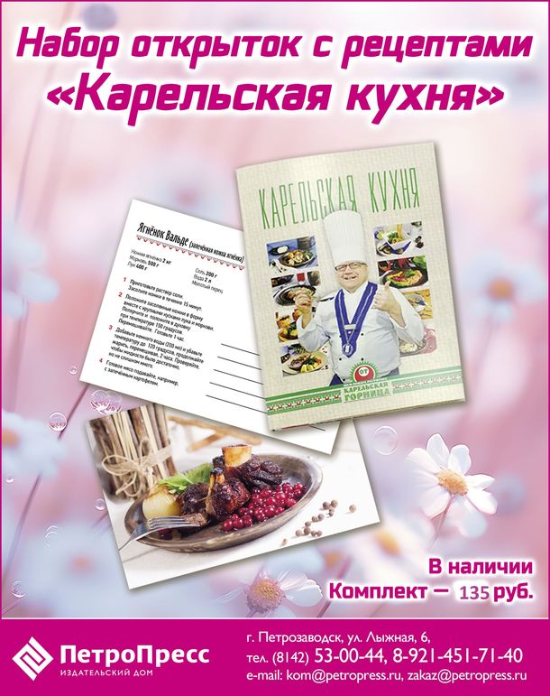 Хозяйкам в помощь - книга, календарь или набор открыток "Карельская кухня" от шеф-повара "Карельская горница" - в книге по крупицам собраны и доработаны лучшие национальные рецепты с пошаговыми инструкциями и великолепными фотографиями. Это древние руны карельской кухни, наполненные вдохновением Тармо Васениуса. Готовьте эксклюзивные блюда от шеф-повара у себя дома!